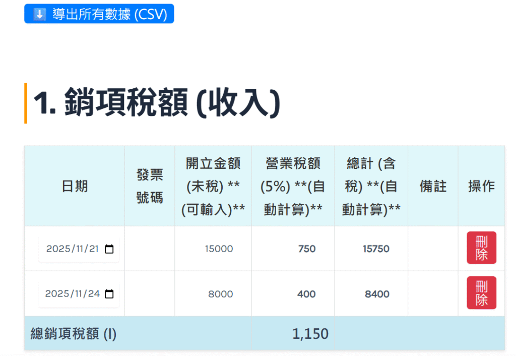 營業稅計算程式 功能: 建議預估稅額 功能說明 : 1 輸入完後的資料 可以導出 2.作業中的資料 存在於使用電腦中 作業畫面 下單購買 購買程式 150 元 營業稅計算 你的大名 你的信箱 Mail (連結會發送至mail) 連絡電話(訂單有問題會與你聯絡 ) 匯款銀行帳號後4碼 匯款日期 發票資訊-開立統編(若無填無: 開立二聯式發票- ) 發票郵寄地址 -郵局掛號to you